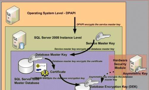 透明数据加密使用一个数据加密密钥(DEK)用于加密数据库,它存储在数据库启动记录中。DEK由一个存储在主数据库中的证书来保护。可选的,DEK可以由一个放置在硬件安全模块(HSM)中的非对称密钥以及外部密钥管理(EKM)的支持来保护。证书的私钥由对称密钥的数据库主密钥来加密,它通常由一个强密码来保护。注意,尽管这个证书可以由一个密码来保护,但是TDE要求这个证书由数据库主密钥来保护。数据库主密钥由服务主密钥来保护,而服务主密钥由数据保护API来保护。