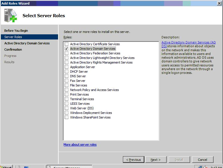 我将先安装活动目录域服务,此服务必须单独安装,不可以和其他服务一起安装。如下图(22)所示。