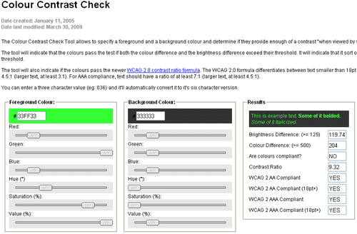 这些工具可以帮助你设计网站,使你的网站有一个合适的前景色与背景色的对比度。某些工具可以检测色差和亮度差的平衡性,并显示出结果,包括亮度差、色差、颜色匹配、比对度,及相应的从AA到AAA等级的WCAG 2值。