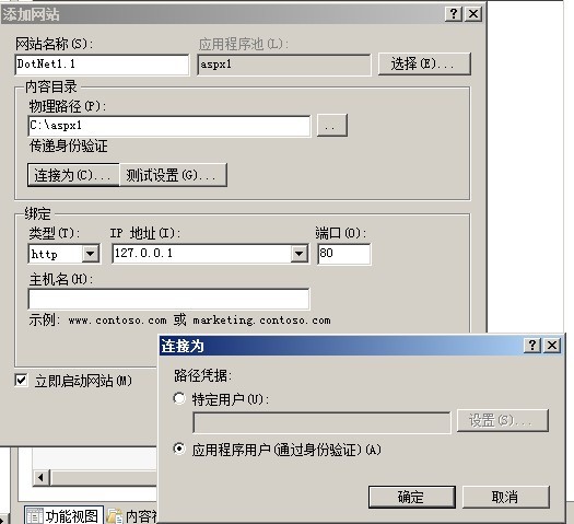 现在开始新建网站了,应用程序池选择刚才我们新建的,其他的自己定义,这里说明下"连接为",我们选择应用程序用户(通过身份验证)。